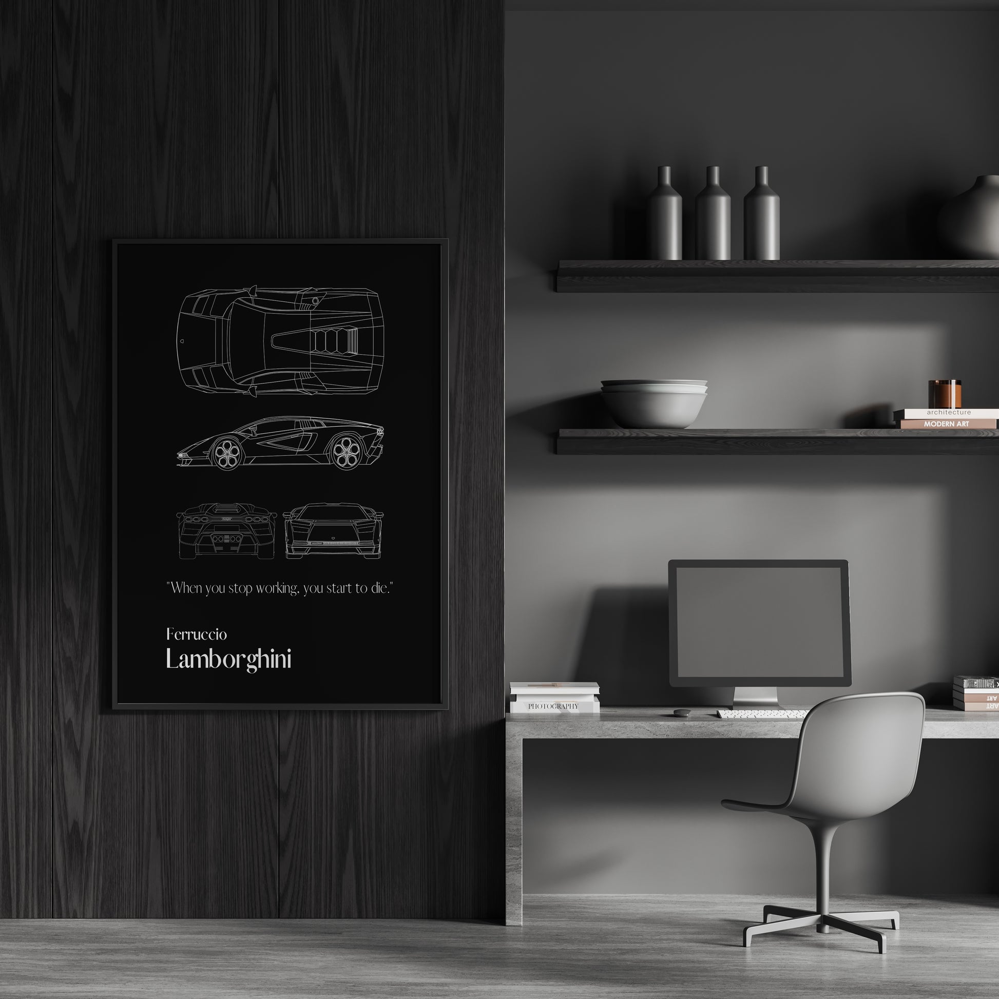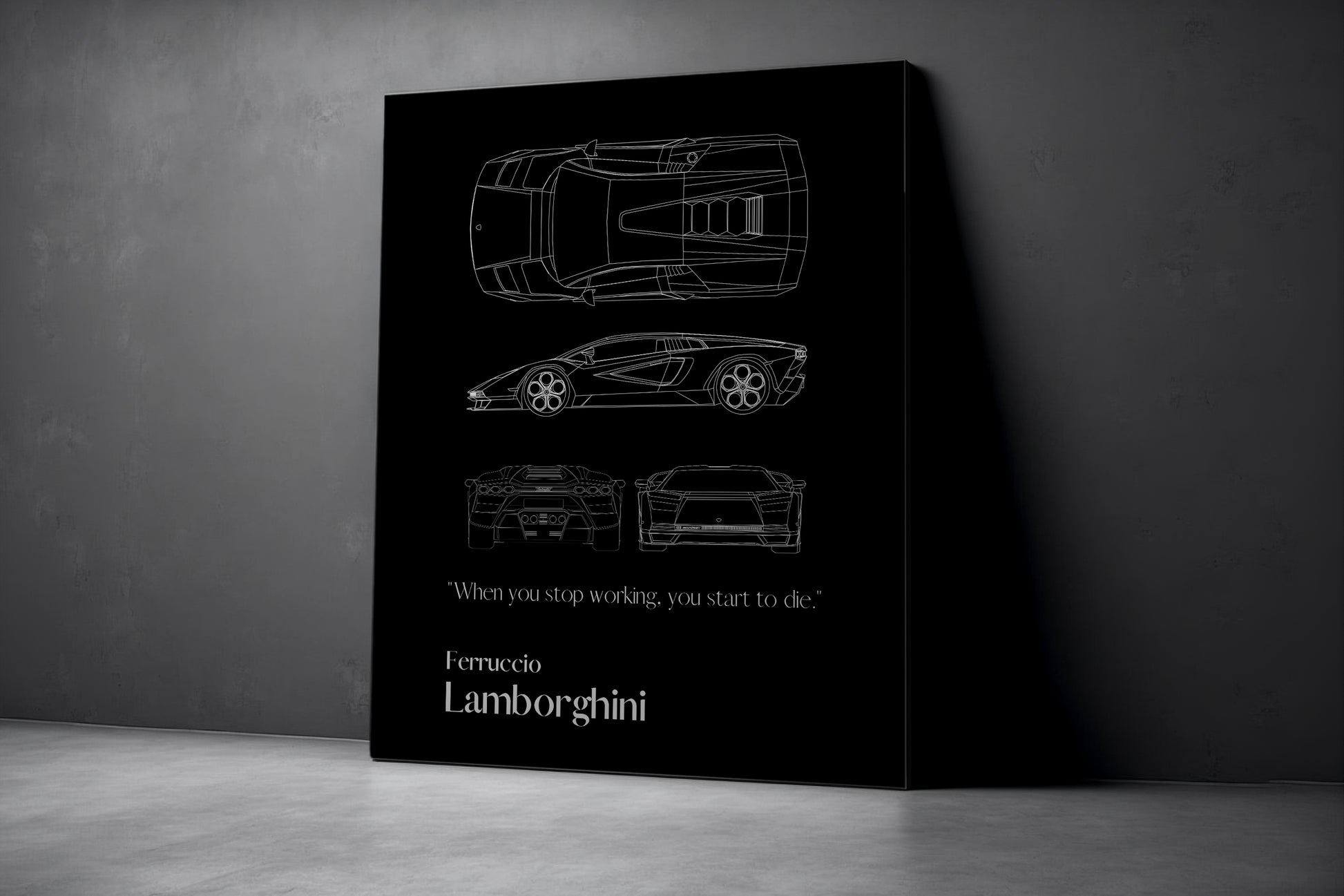 Introducing our captivating canvas art that seamlessly merges the breathtaking allure of a Lamborghini with the resounding wisdom of Ferruccio Lamborghini's words: "When you stop working, you start to die." This art piece is a powerful testament to the synergy between automotive excellence and the unyielding spirit of entrepreneurship, echoing the relentless pursuit of innovation and success.