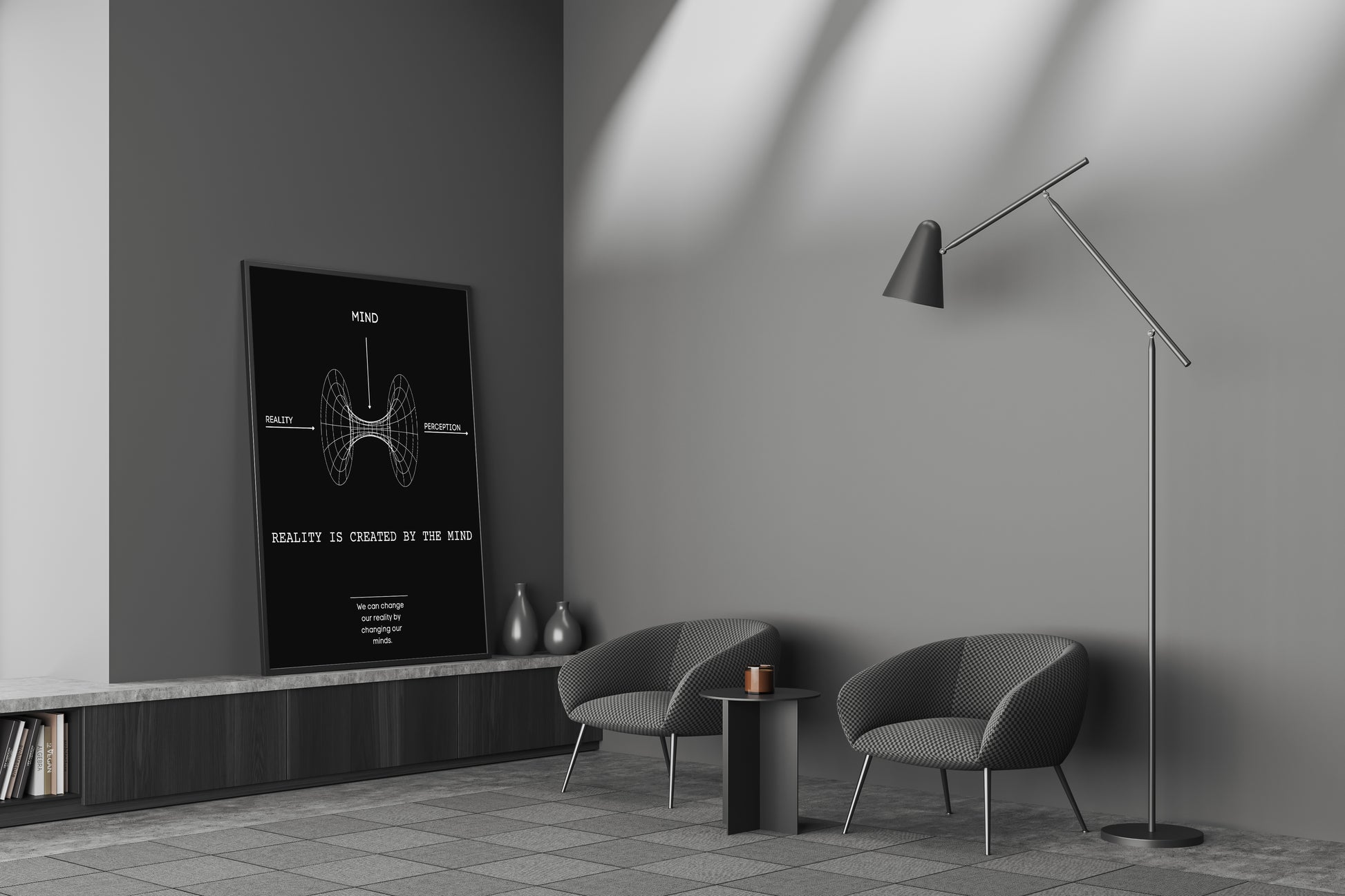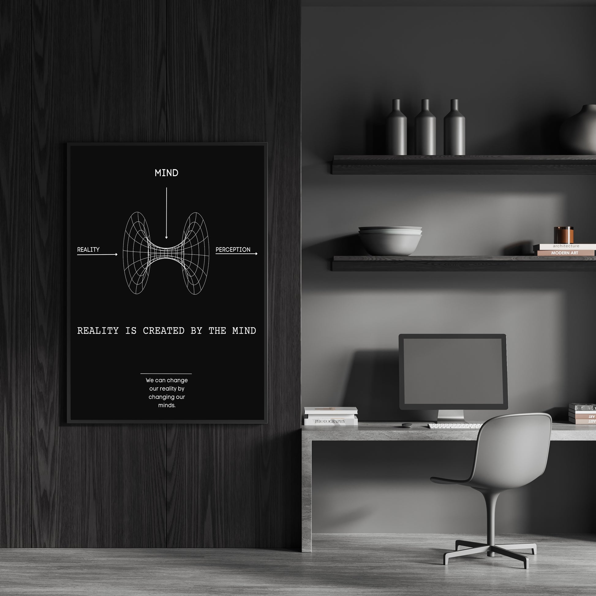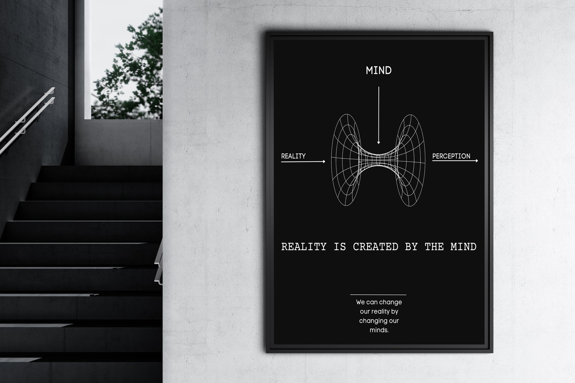 Elevate your space with profound wisdom through our "Reality" piece featuring the transformative quote, "Reality is created by the mind, we can change our reality by changing our minds." Let this artwork serve as a daily affirmation, urging you to reconsider the power of your thoughts in shaping the world around you.