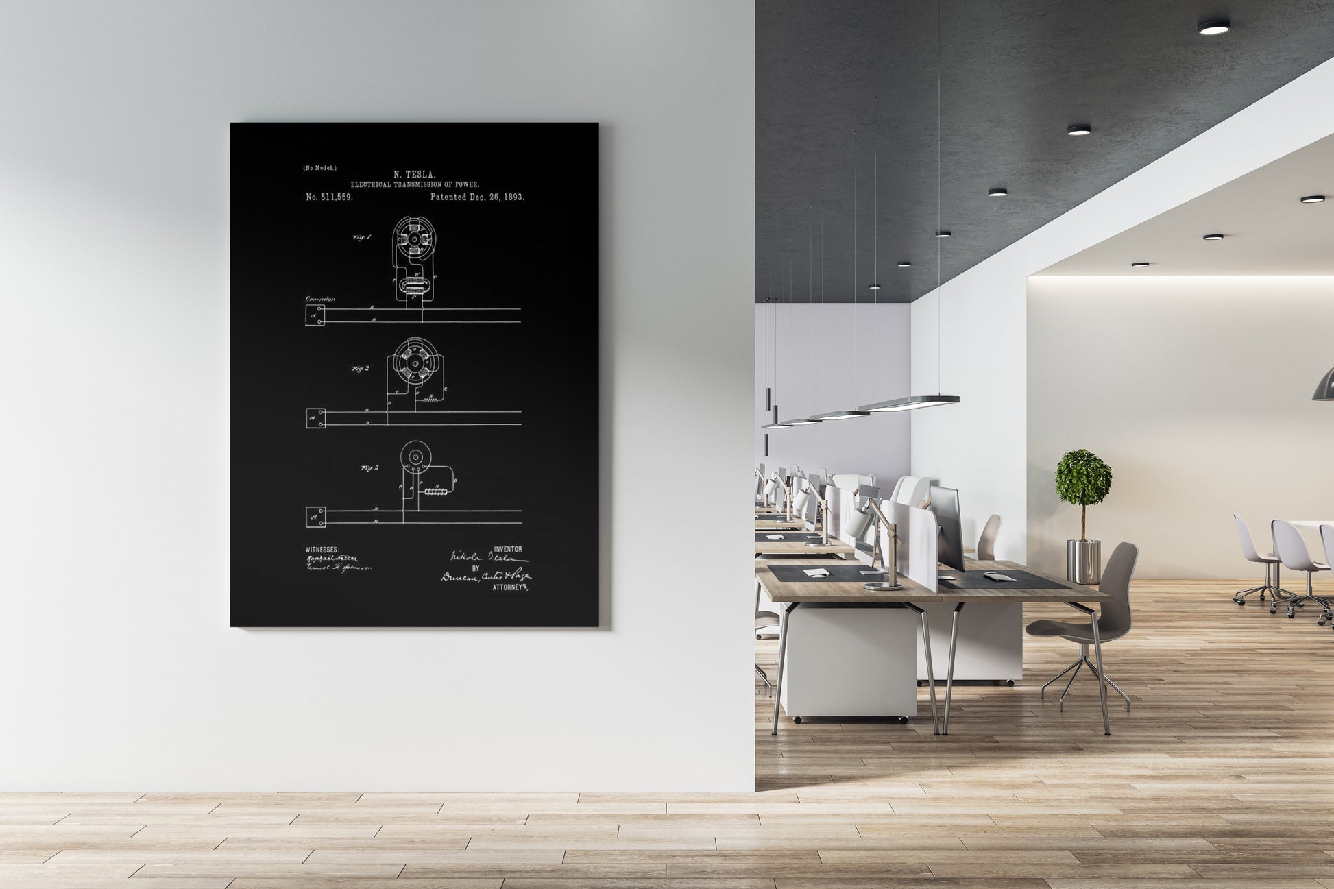Tesla's patent design, etched onto the canvas, resonates with the essence of relentless exploration. Just as Tesla harnessed electricity's potential, this artwork electrifies the space it occupies. Display it prominently to evoke the entrepreneurial energy that fueled Tesla's creations.