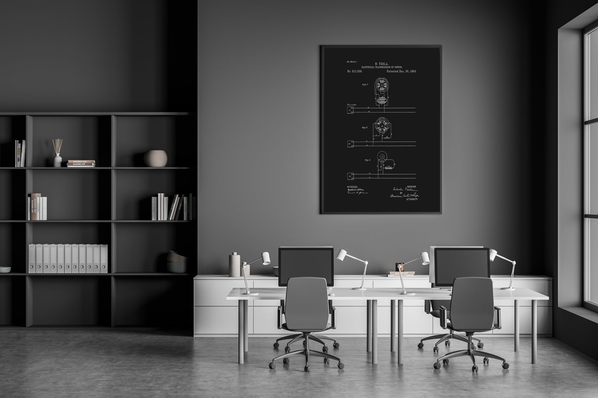 Let the intricate details of the patent design inspire you to embrace challenges with the same fervor Tesla exhibited. As light dances upon the canvas, absorb the wisdom of his endeavors and channel it into your own ventures. This art isn't just a tribute; it's a conduit to the enterprising spirit that drives progress. Illuminate your surroundings with innovation, and let Tesla's legacy spark your own entrepreneurial journey.